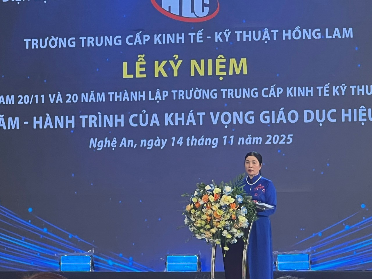 Phát biểu tại buổi lễ, bà Hồ Thị Châu Loan – Phó Giám đốc Sở Giáo dục và Đào tạo Nghệ An gửi lời chúc mừng sâu sắc tới tập thể cán bộ, giáo viên nhà trường nhân kỷ niệm Ngày Nhà giáo Việt Nam 20/11, đồng thời đánh giá cao những đóng góp của Trường Trung cấp Kinh tế – Kỹ thuật Hồng Lam trong suốt 20 năm qua.