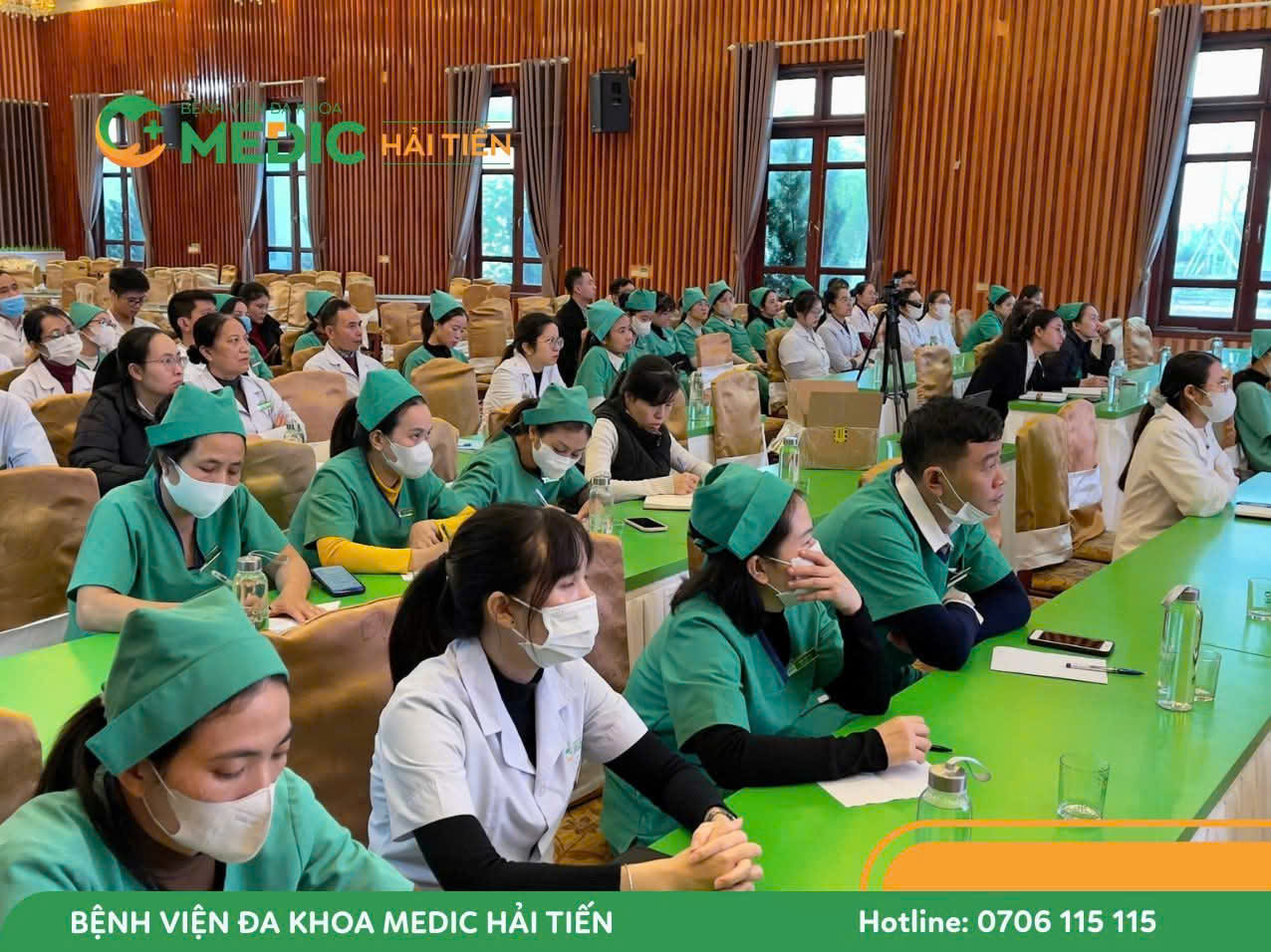 Các bác sĩ và điều dưỡng Medic Hải Tiến trong buổi tập huấn chuyên môn, hướng tới nâng cao chất lượng chăm sóc người bệnh.