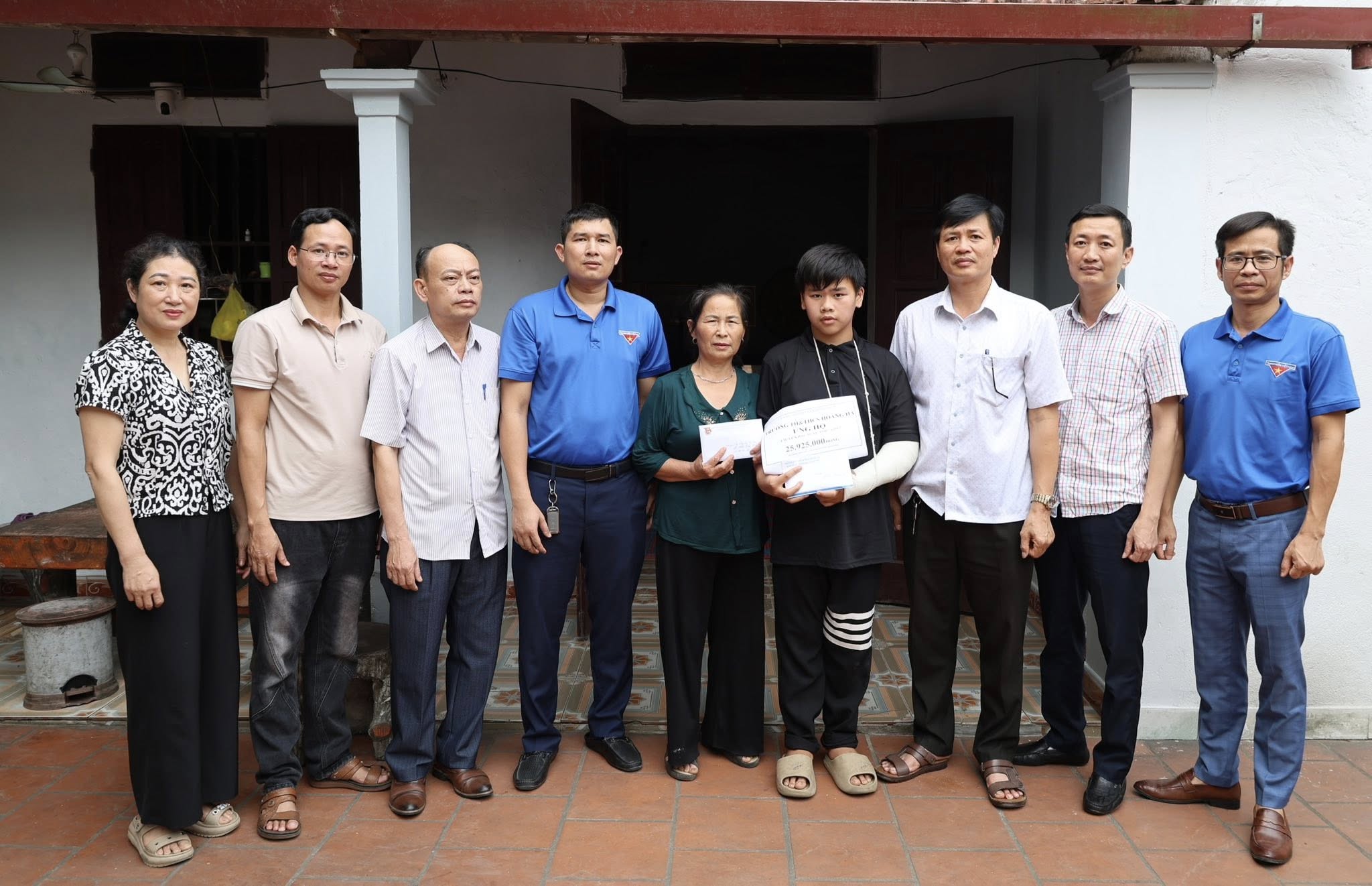 Đại diện chính quyền địa phương, Đoàn Thanh niên và nhà trường trao hỗ trợ cho em Lê Khắc Tuấn Anh cùng gia đình, lan tỏa tinh thần sẻ chia và trách nhiệm cộng đồng đối với học sinh có hoàn cảnh khó khăn.