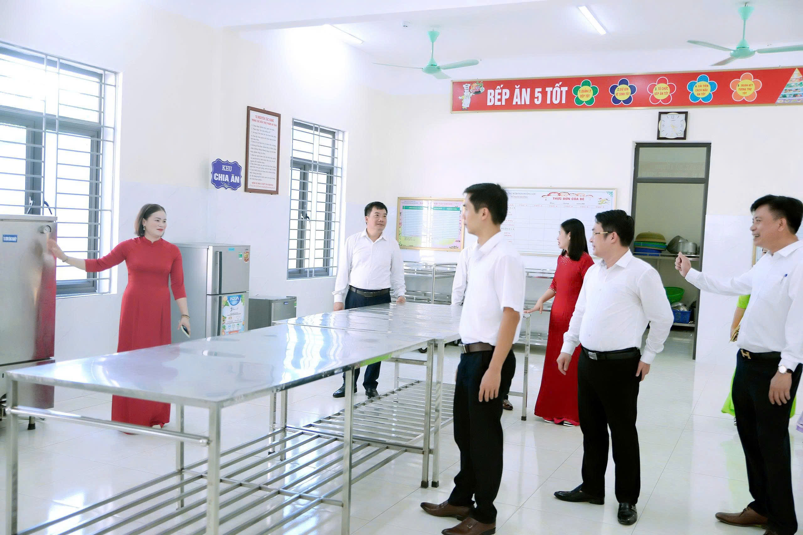 Bếp ăn bán trú tại trường mầm non xã Hoằng Lộc Bà Nguyễn Thị Mai hiệu trưởng nhà trường dẫn đoàn đi kiểm tra. (Ảnh đơn vị cung cấp)