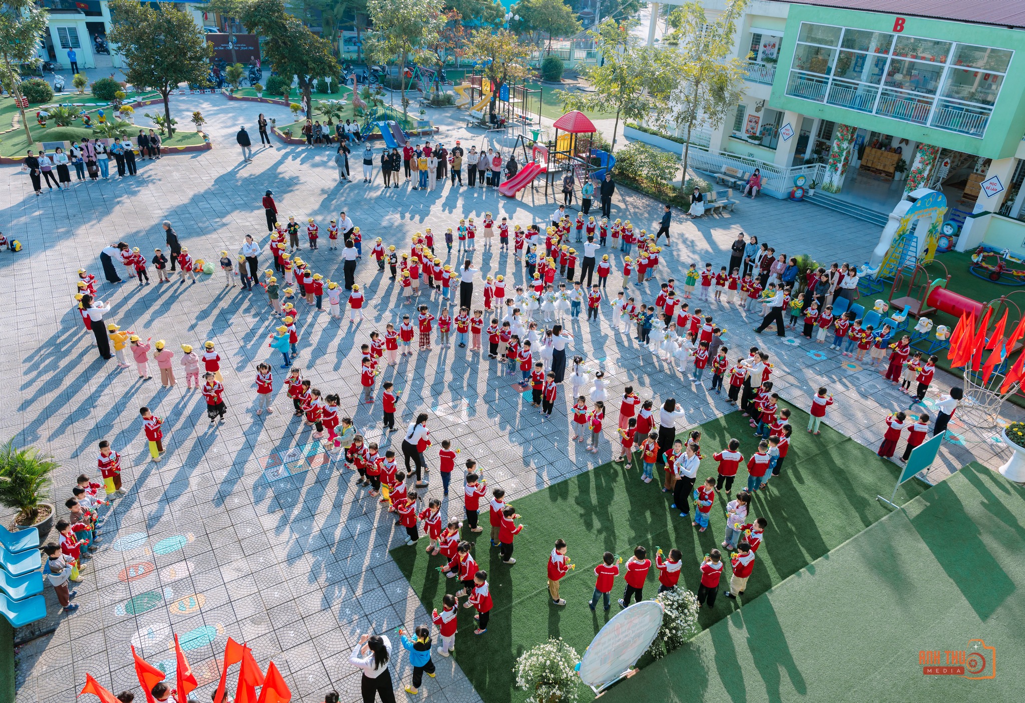 Ngoài ra, nhà trường luôn cố gắng trong công tác tham mưu cho các cấp, các ngành trong việc đầu tư cơ sở vật chất với các phòng học tập, phòng chức năng, vườn cổ tích, khu vui chơi rộng rãi, thoáng mát, đầy đủ các trang thiết bị đáp ứng nhu cầu chơi mà học của trẻ, áp dụng các tiến bộ công nghệ thông tin vào giảng dạy, xây dựng và nâng cao chất lượng đội ngũ giáo viên. Hiện nay, nhà trường có 61 cán bộ giáo viên, 100% đều đạt chuẩn. Đội ngũ giáo viên luôn nhiệt tình trong công tác, tích cực học tập nâng cao trình độ chuyên môn nghiệp vụ, luôn có các sáng kiến kinh nghiệm hay trong giảng dạy để dự thi, có tinh thần đoàn kết nội bộ, có phẩm chất đạo đức, yêu nghề mến trẻ. Các đoàn thể trong trường đã và đang duy trì tốt mọi nề nếp hoạt động, hưởng ứng, tham gia các phong trào mạnh mẽ.