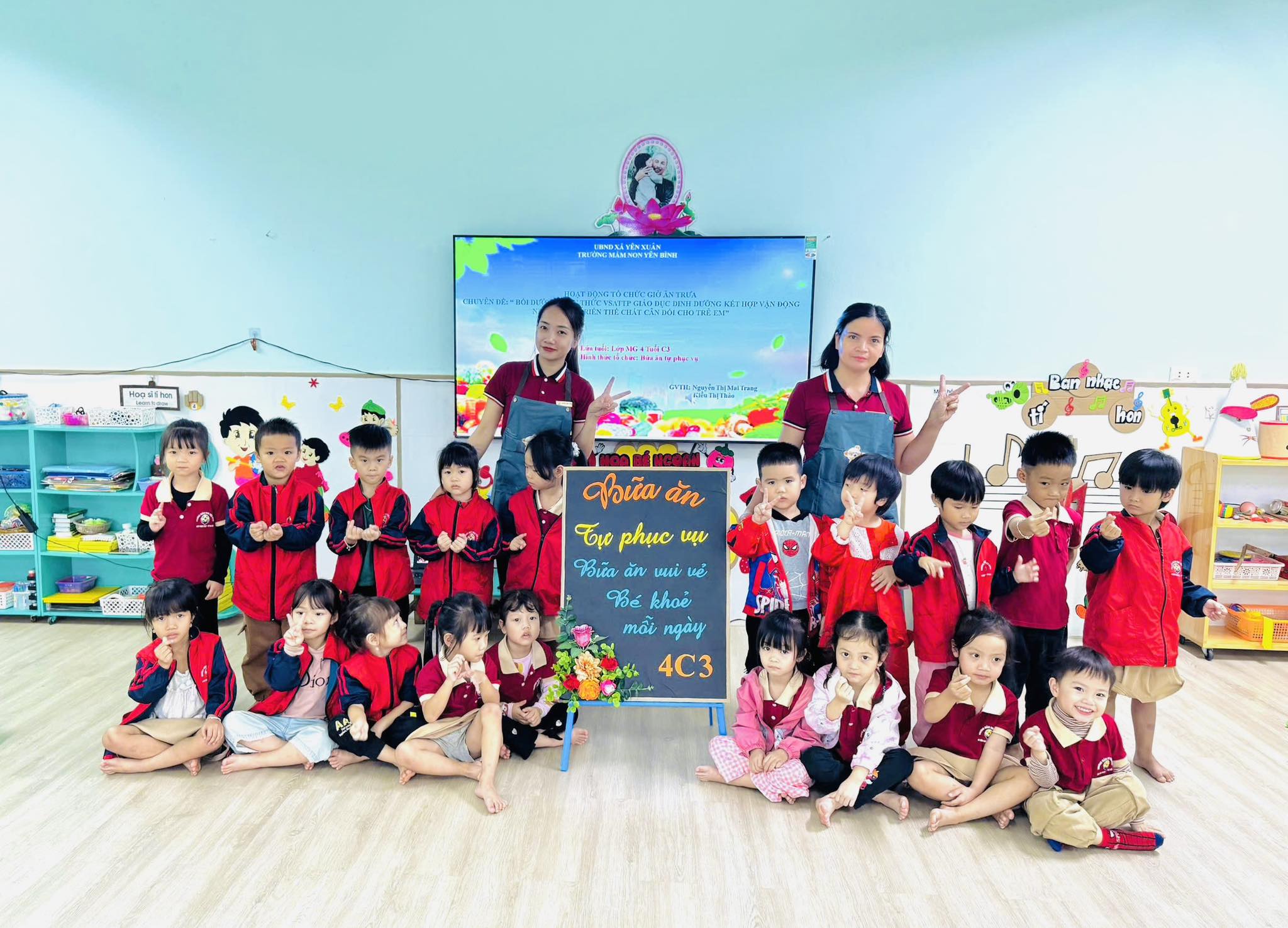 Bên cạnh đó, nhà trường chú trọng giáo dục trẻ hình thành nề nếp, thói quen văn minh trong ăn uống, vệ sinh cá nhân và bảo vệ môi trường; đồng thời rèn luyện kỹ năng tự phục vụ trong sinh hoạt hằng ngày. Công tác chăm sóc, nuôi dưỡng được thực hiện khoa học, từ việc lựa chọn nguồn thực phẩm an toàn đến xây dựng khẩu phần ăn cân đối, thực đơn đa dạng, phong phú, phù hợp với từng độ tuổi. Việc tổ chức bữa ăn bán trú cho trẻ được triển khai theo phương châm “ngon – sạch – đẹp”; các nhóm, lớp chuẩn bị bàn ăn chu đáo với khăn trải bàn, lọ hoa, tạo không khí thân thiện, ấm cúng trong mỗi bữa ăn. Nhờ thực hiện đồng bộ các giải pháp, khẩu phần ăn của trẻ được bảo đảm đầy đủ các dưỡng chất thiết yếu, góp phần nâng cao thể chất, hạn chế và phục hồi kịp thời tình trạng suy dinh dưỡng.