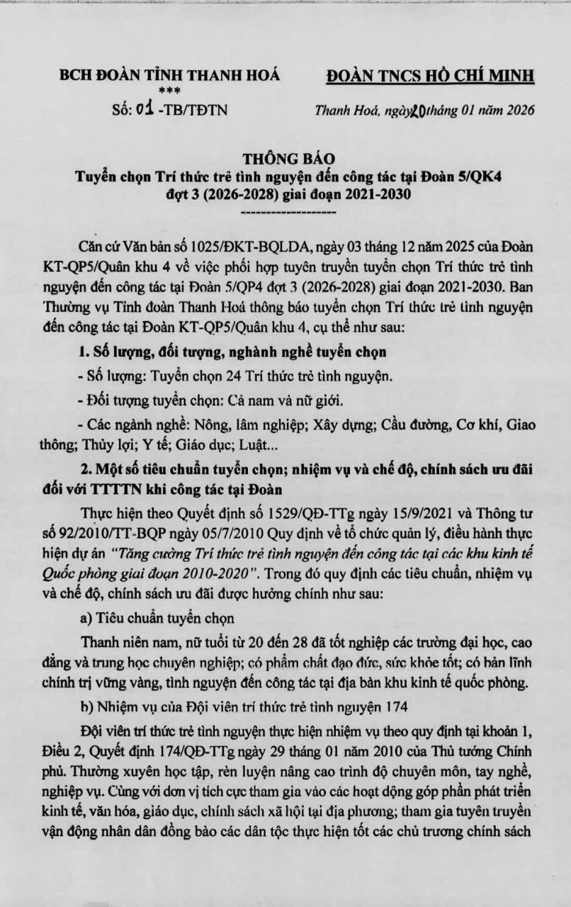 TLGD – Có những chuyến đi không chỉ để đến, mà là để trưởng thành. Có những lựa chọn không chỉ vì mưu sinh, mà là để kiến tạo giá trị cho cộng đồng. Thông báo tuyển chọn Trí thức trẻ tình nguyện đợt 3 (giai đoạn 2026-2028) của Tỉnh đoàn Thanh Hóa vừa qua như một “lời hiệu triệu” đầy ý nghĩa, gửi đến thế hệ thanh niên xứ Thanh và cả nước về một hành trình đặc biệt: Lên đường về Mường Lát, hòa mình vào màu áo lính tại Đoàn Kinh tế – Quốc phòng 5 để viết nên những năm tháng thanh xuân rực rỡ nhất.